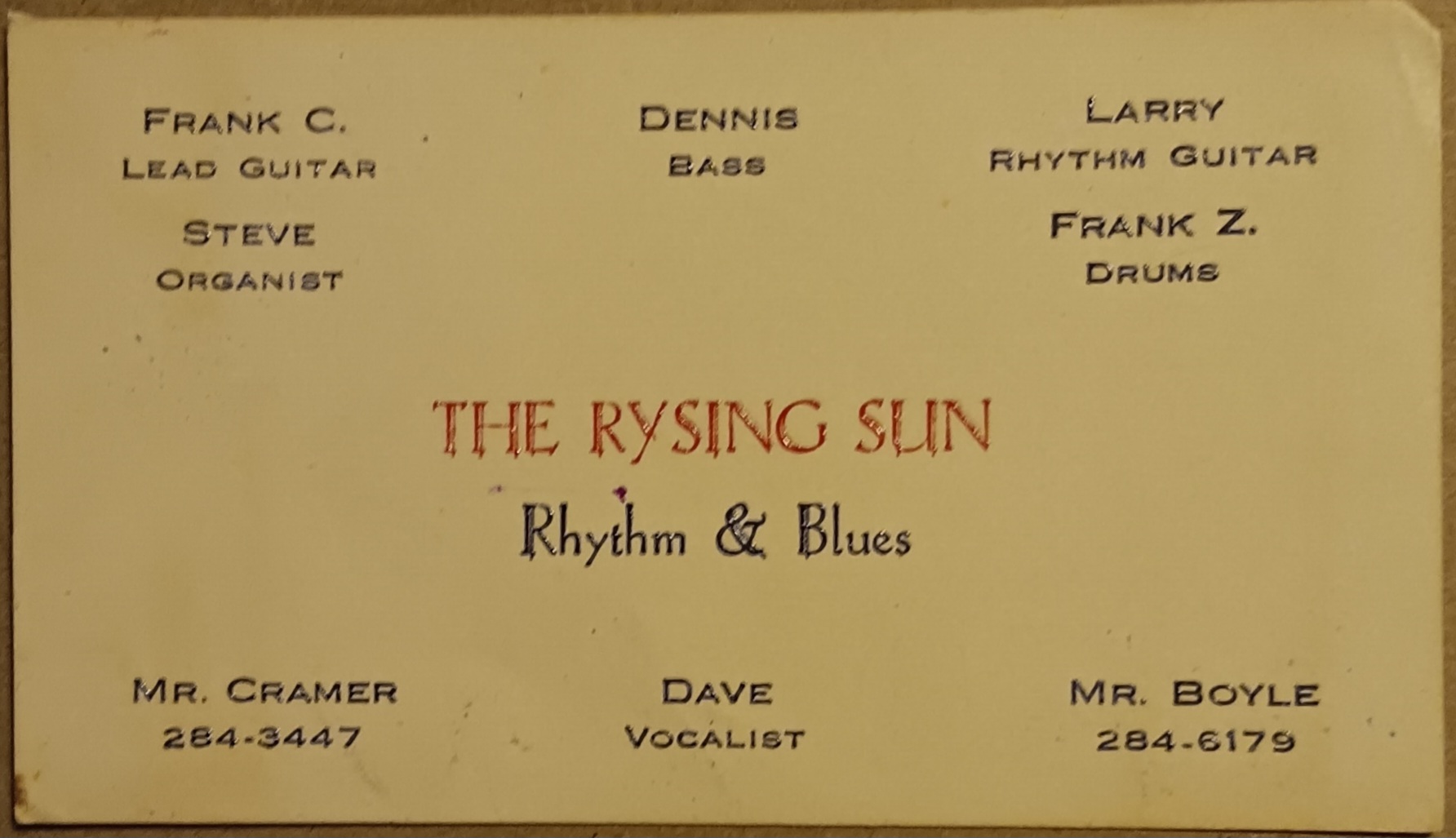 "I spent my summers in Cape May and joined up with great guys from South Philly, The Chip Bond Band, and played from Ocean City NJ, Wildwood and we had our own teen grotto in Cape May. After that went to UVA and got a chance to play with the traveling R&B bands (black) who played all over the South...what A KICK! and learned most of what I know... which now isn't much but I still play. My son Tommy in CA went on to become an excellent R&R drummer and still plays."