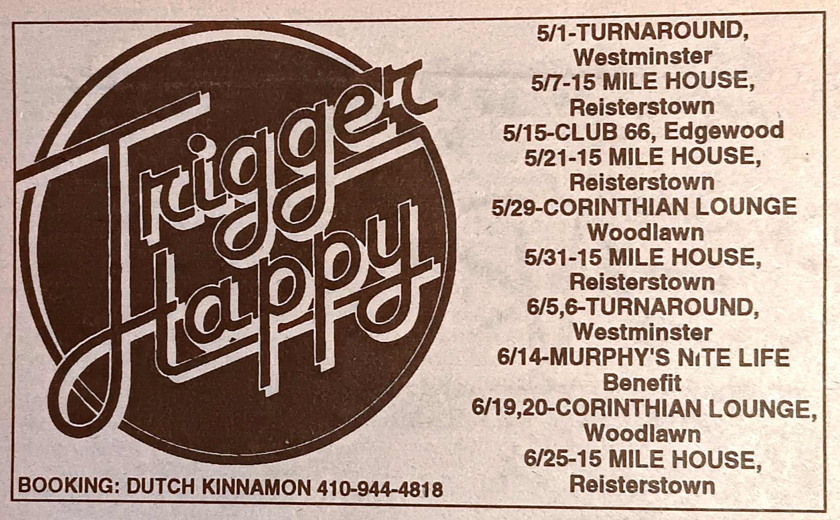 The group performed throughout Baltimore, D.C. and mid-Atlantic region. Venues included Fletchers, The 8 X 10, Cafe Tattoo, The Vault, Brass Monkey Saloon, The Sidebar, Cacao Lane (Ellicott City), DuClaw Brewing Co. (Fells Point), Cheeseburger in Paradise (Pasadena), Doc Watson's Pub and Club DOS (Philadelphia), Fat Tuesday's (Fairfax), and many other clubs and festivals from Pennsylvania to Florida.